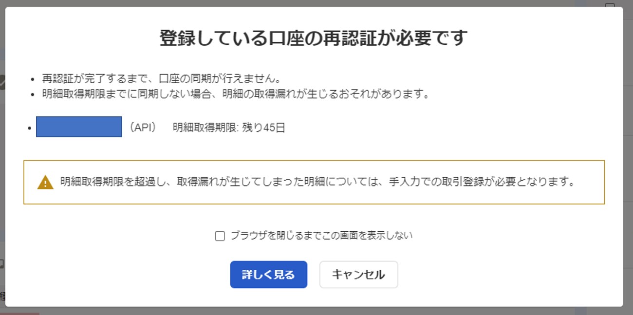 freeeでは口座を連携させていると、定期的にその口座の再認証が求められることがあります。この再認証作業をしない限り、口座の同期が出来ずに、明細の取得漏れなどが生じる恐れがあるので、再認証が求められた場合には、すぐに対応することをオススメします。
