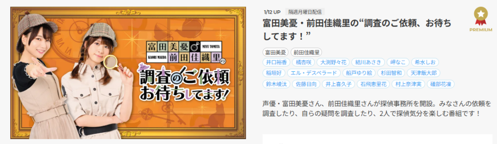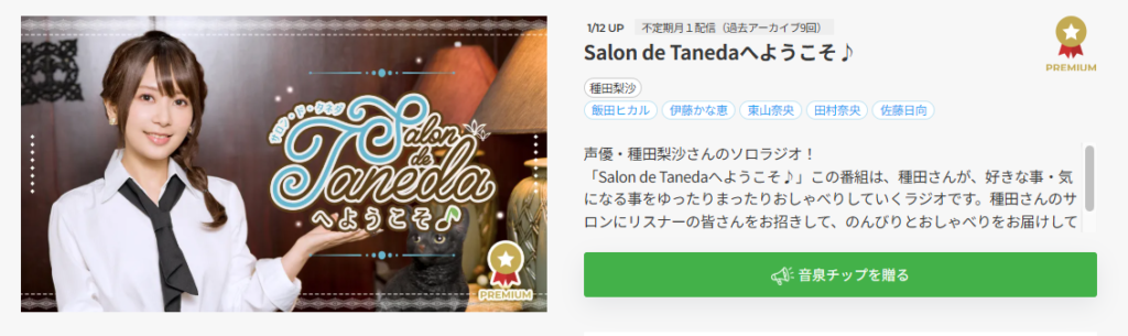 私が今継続して聞いているのは、「声優・種田梨沙」さんのソロラジオと「声優・富田美憂さん、前田佳織里さん」の番組です。いずれも好きなアニメがきっかけで聞くようになりました。種田さんのラジオはほっこりしてて癒されるし、富田さん・前田さんのラジオはお二人のトークや掛け合いが面白いです。